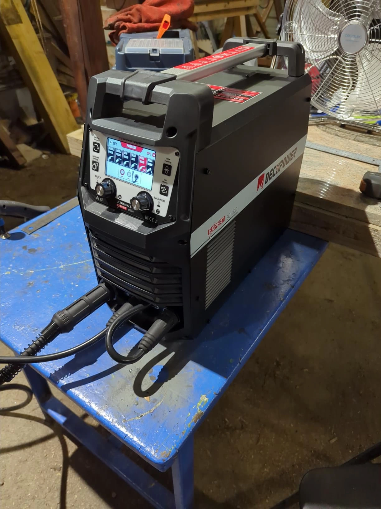 I want to disclose that I purchased this welder, so my review is not biased in any way. I am an experienced welder in TIG, MIG, Flux Core, SMAW(Stick), and own several high-end welders including a Miller 200, and an Everlast Multiprocess with pulse function. First, let me say Jent, my Decapower contact, was great in providing information about the welder in a timely fashion, and was enjoyable to communicate with. I saw the Ultramig 230 Expert on youtube videos and thought the display was one of the best I’ve seen in any price range. I ordered the welder from Decapower and it arrived in perfect condition. I bought it without the mig torch and ground, since I have several extras in my shop, so I can’t comment on the quality of the torch and ground that comes with the welder. The welder is only about 14 Kg (30 lbs), and has a strong carry handle, making it easy to move or take to a different location. It is made of quality heavy gauge steel.